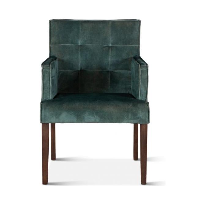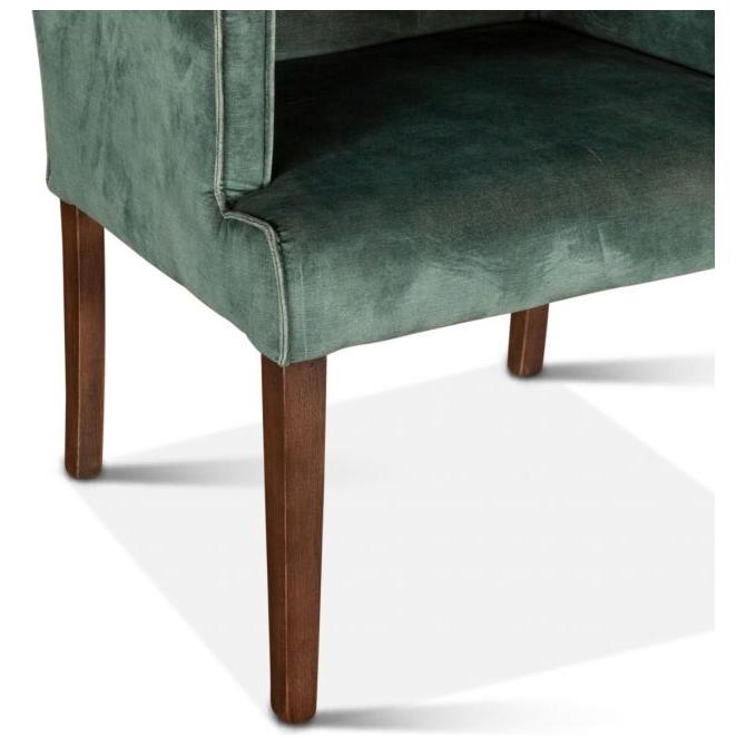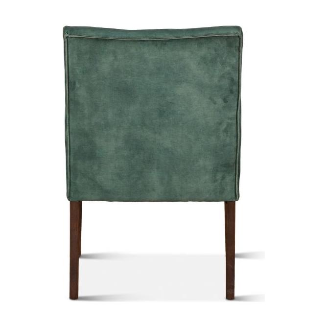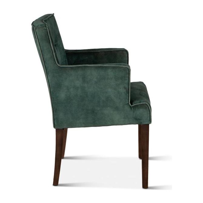 The Maddie Armchair features rich green velvet upholstery wrapped around a solid hardwood frame. Its square-stitched backrest adds texture and visual interest, while the dark-finished legs create a grounded, modern silhouette. This armchair balances elegance and comfort, making it a refined addition to both residential and commercial dining spaces.