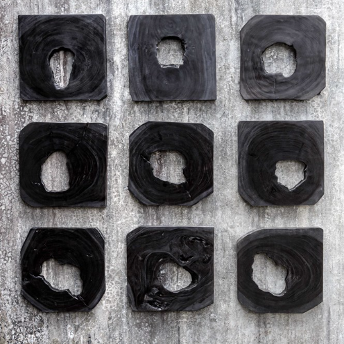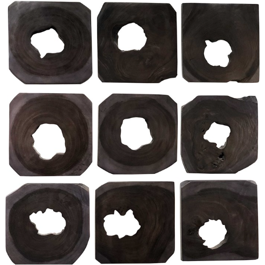 This set of 9 wood wall art features cross sections of solid natural suar wood finished in a smooth ebony stain. Because each is individually handcrafted, natural variation will occur from piece to piece.