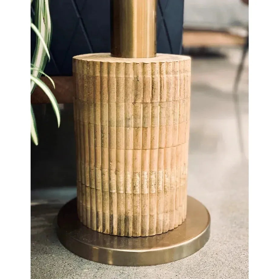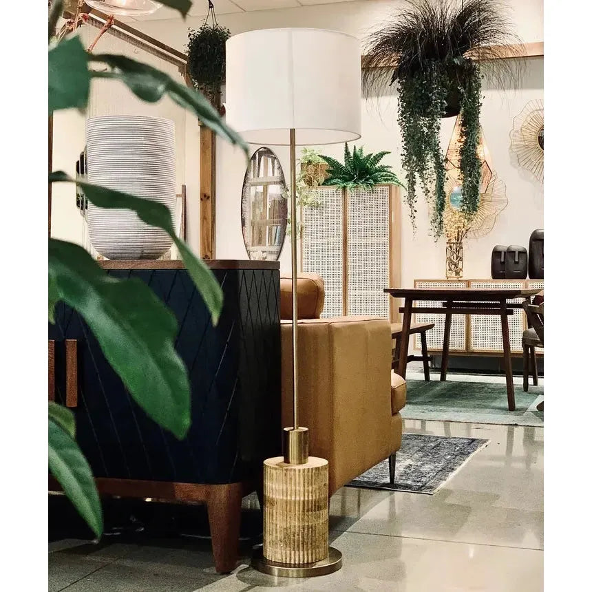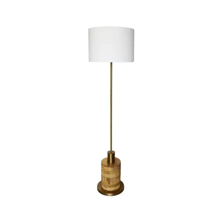 The Caelen Floor Lamp pairs a warm, grounded wood base with sleek iron accents and a clean white drum shade. Its mixed-material design balances rustic strength with modern elegance, making it a versatile statement piece for any room.