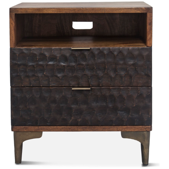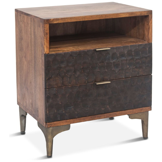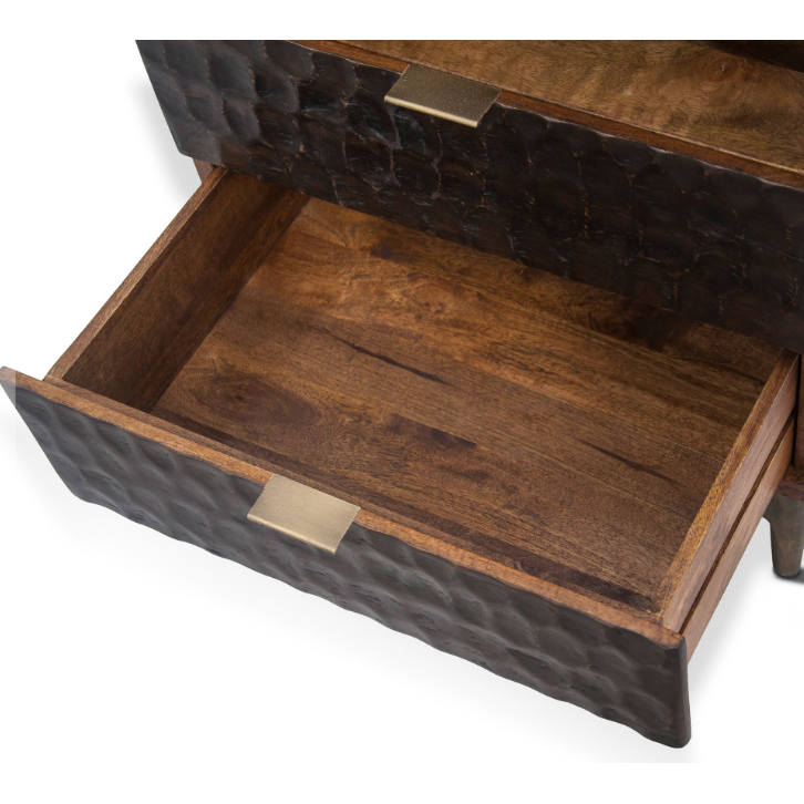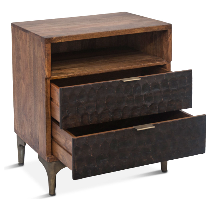 The Cruz Nightstand seamlessly blends contemporary design with timeless craftsmanship. Hand-carved mango wood and iron accents, finished in muted gold, create a stunning visual contrast. The catalyzed water-based finish adds both luminosity and durability, making this table a beautiful and practical addition to any dining room.