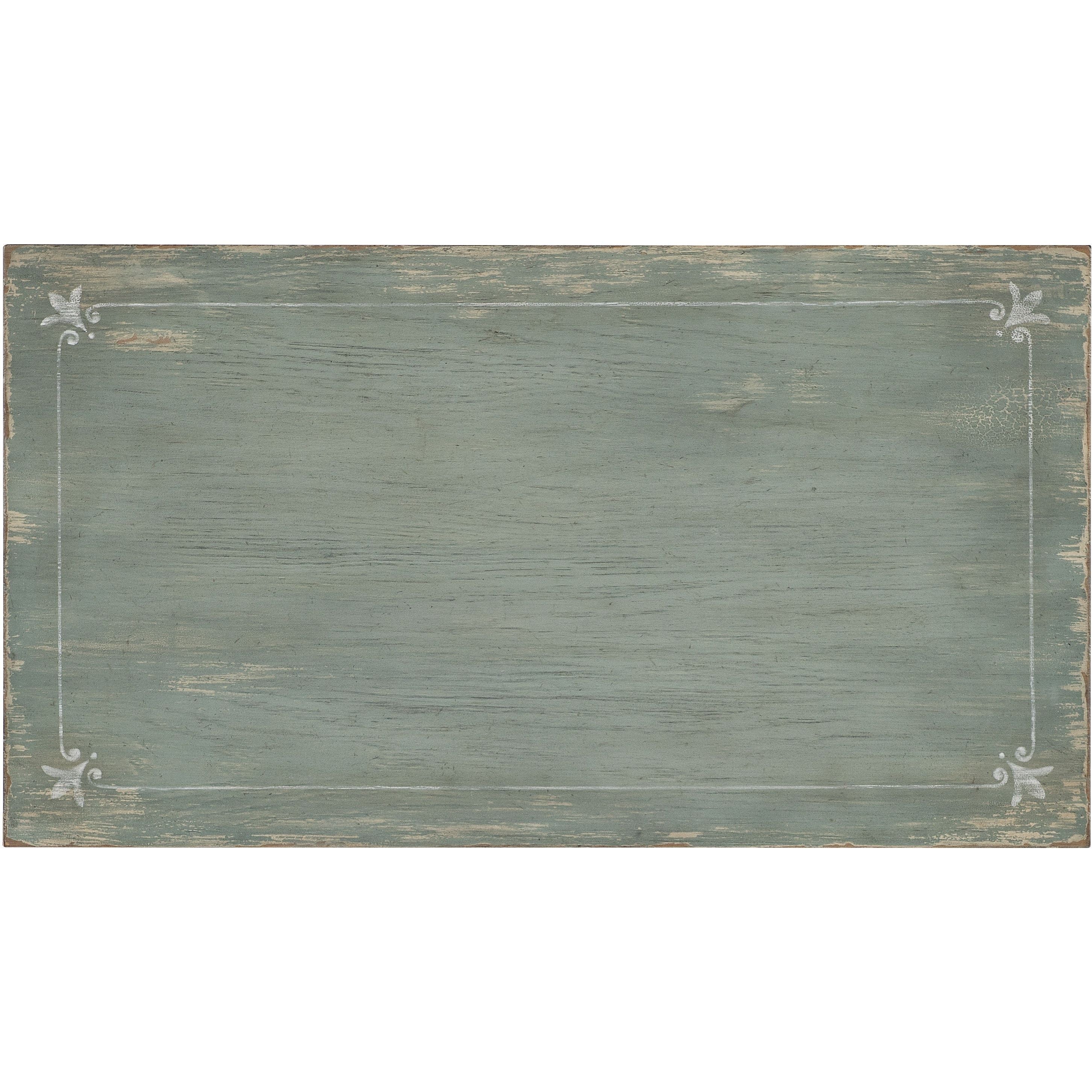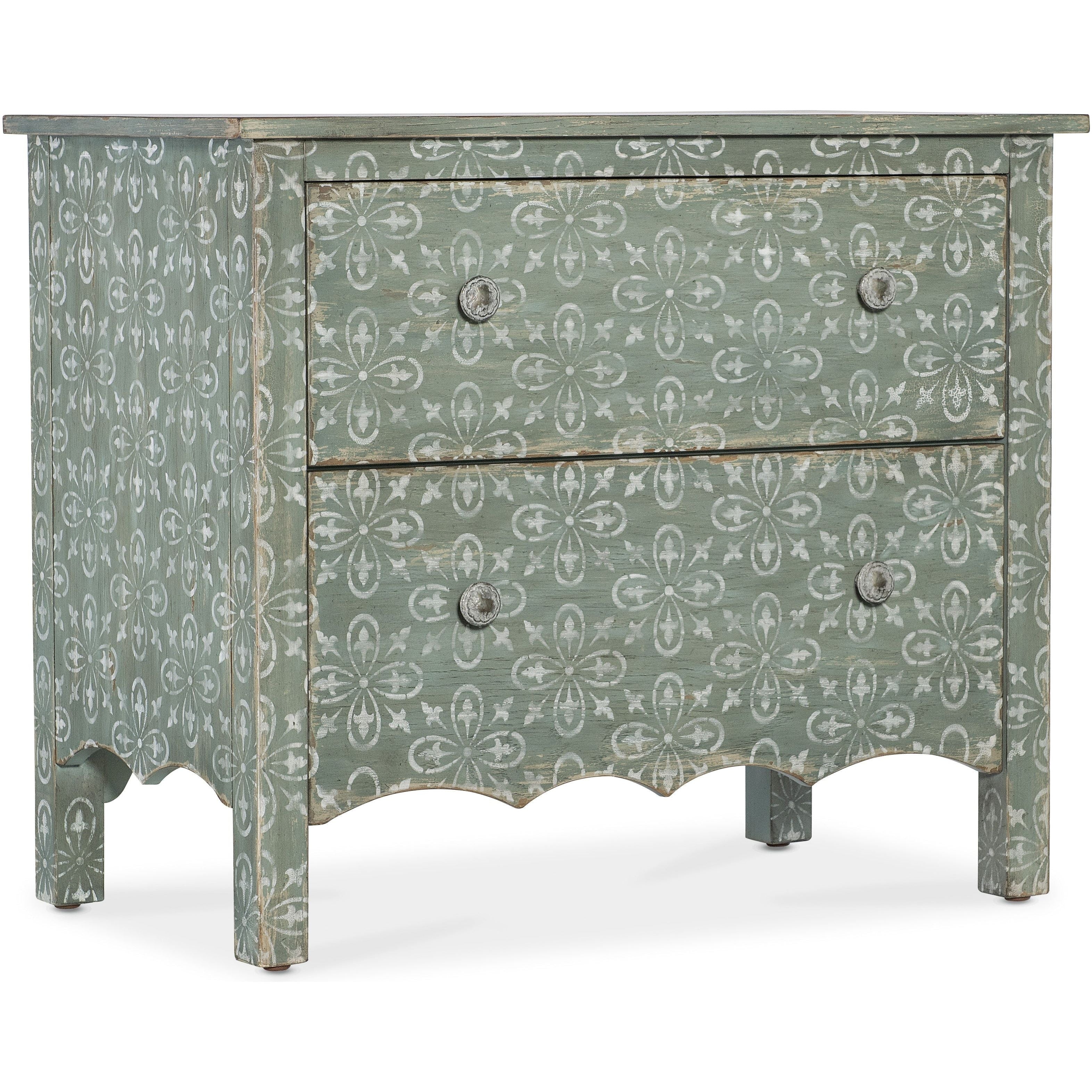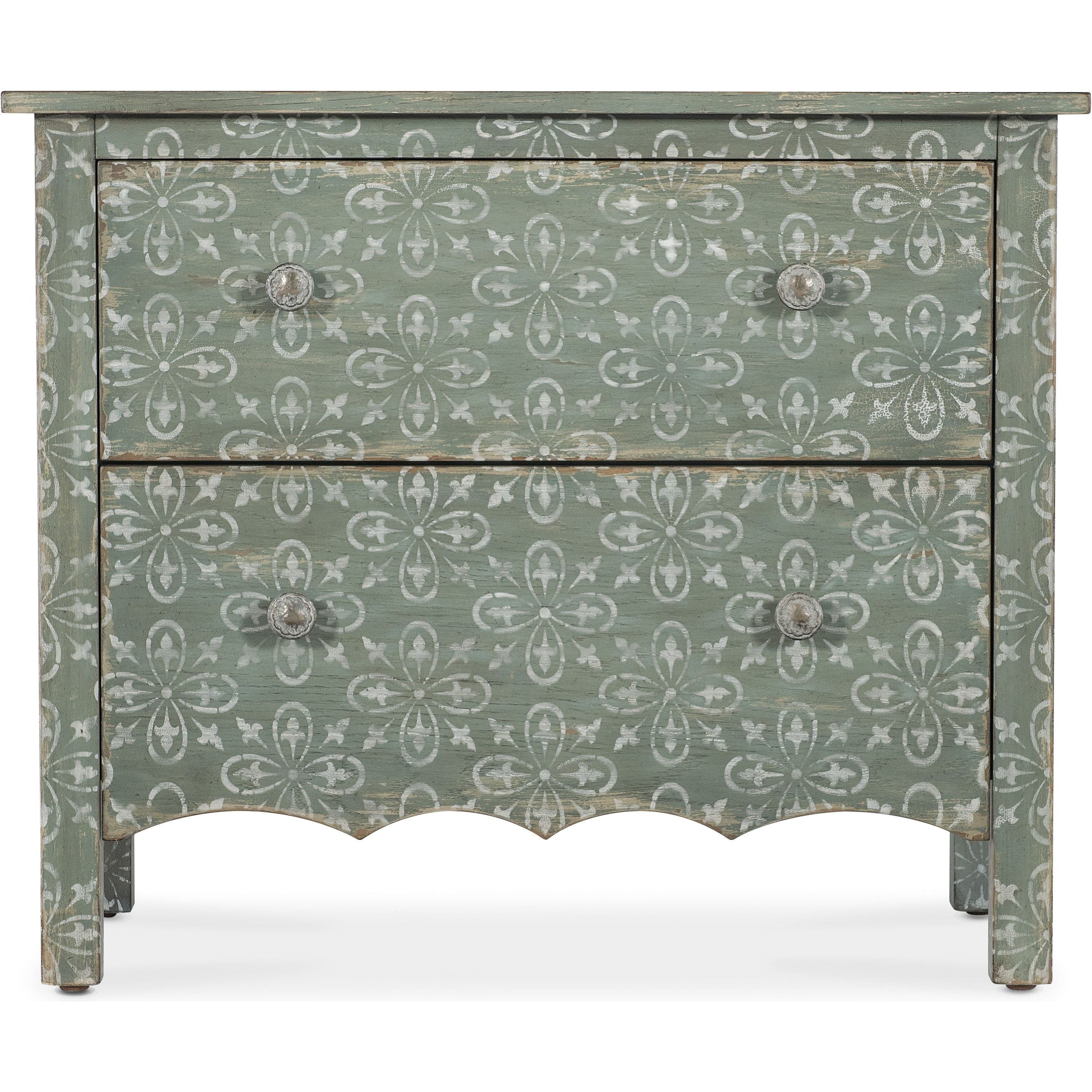 Explore the classic elegance of the Florence Nightstand from the Florence Collection. Adorned in an antique green finish with detailed distressing and rub-through. The nightstand boasts a white finished scroll pattern and is finished with metal alloy knob pulls in an antique pewter with a white hang-up. With two self-closing drawers, the top drawer also includes a removable black felt liner.