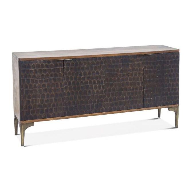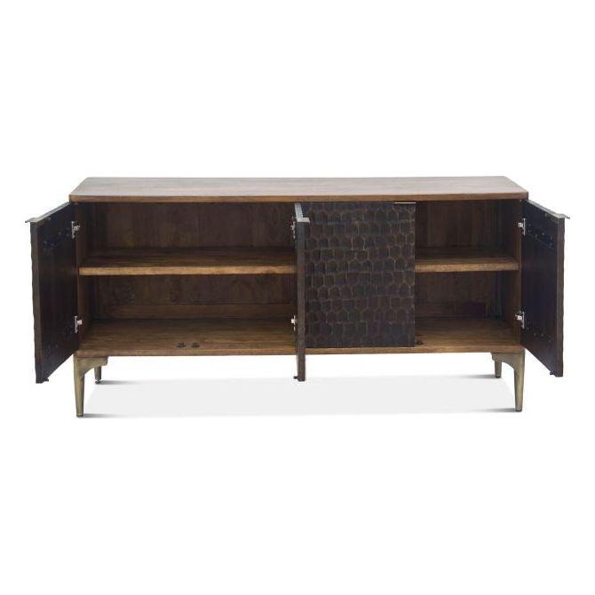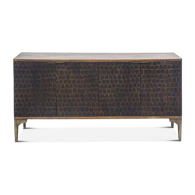 The Cruz Sideboard seamlessly blends contemporary design with timeless craftsmanship. Hand-carved mango wood and iron accents, finished in muted gold, create a stunning visual contrast. The catalyzed water-based finish adds both luminosity and durability, making this table a beautiful and practical addition to any dining room.