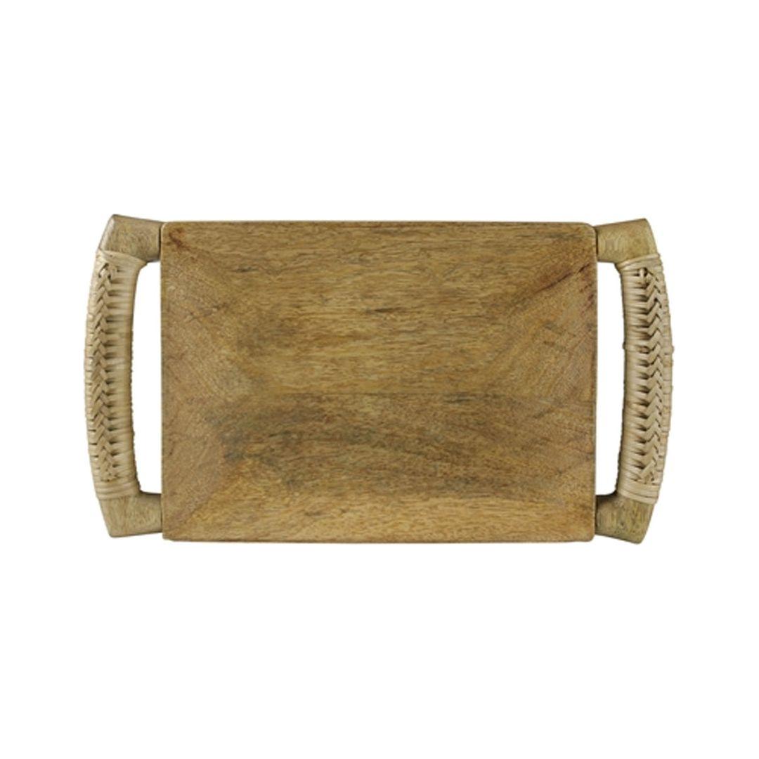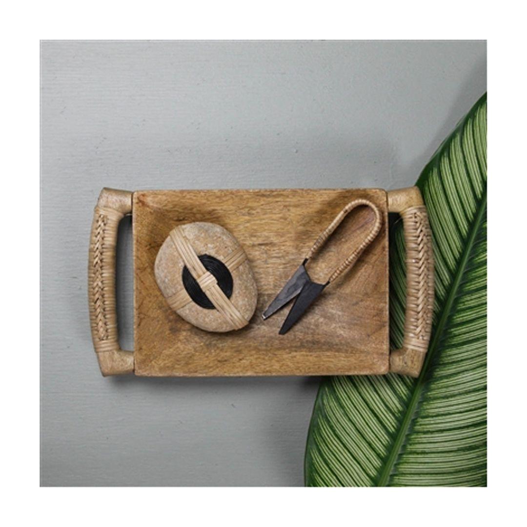 A hewn mango wood tray with rattan wrapped handles creates a perfect catchall for keys, coins or jewelry. For decorative use only.