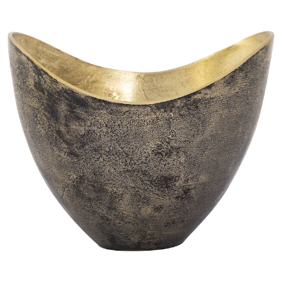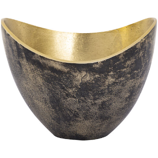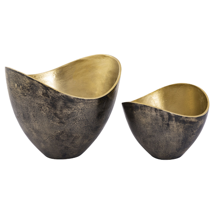 The Leisl Bowls are small metal bowls with a sloped rim. The bowls have a two-tone finish, with the exterior a painted black and the interior a polished brass.