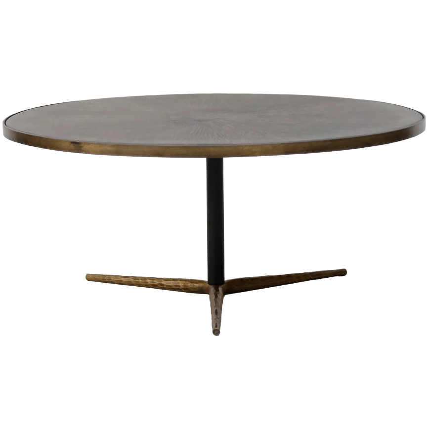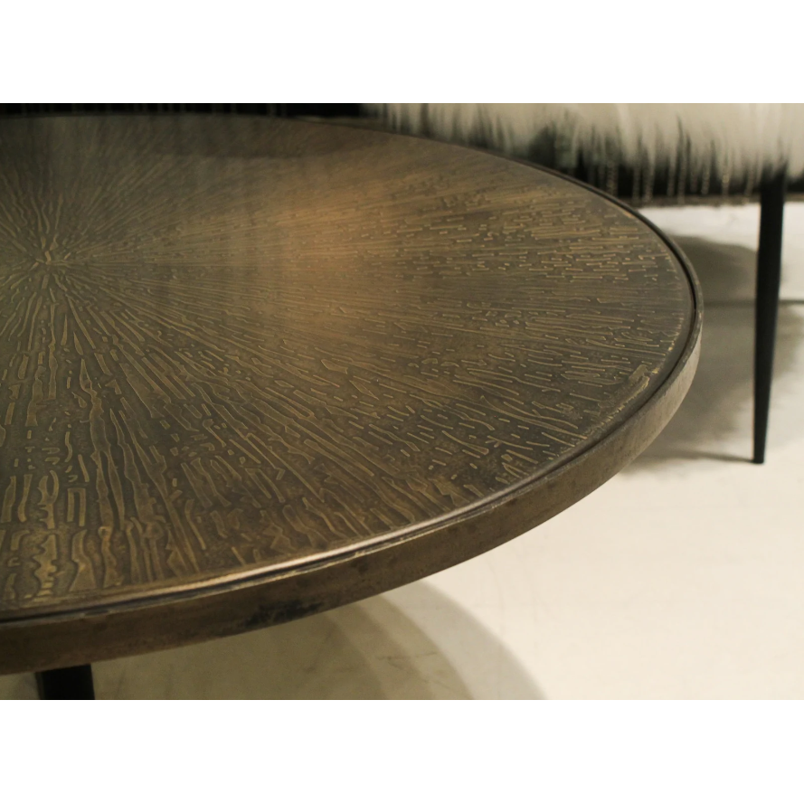 The Becker coffee table features a brass circular top with a striking etched texture that radiates outward like sunbursts. Supported by a sleek pedestal stem and tripod base, it merges sculptural artistry with refined functionality.