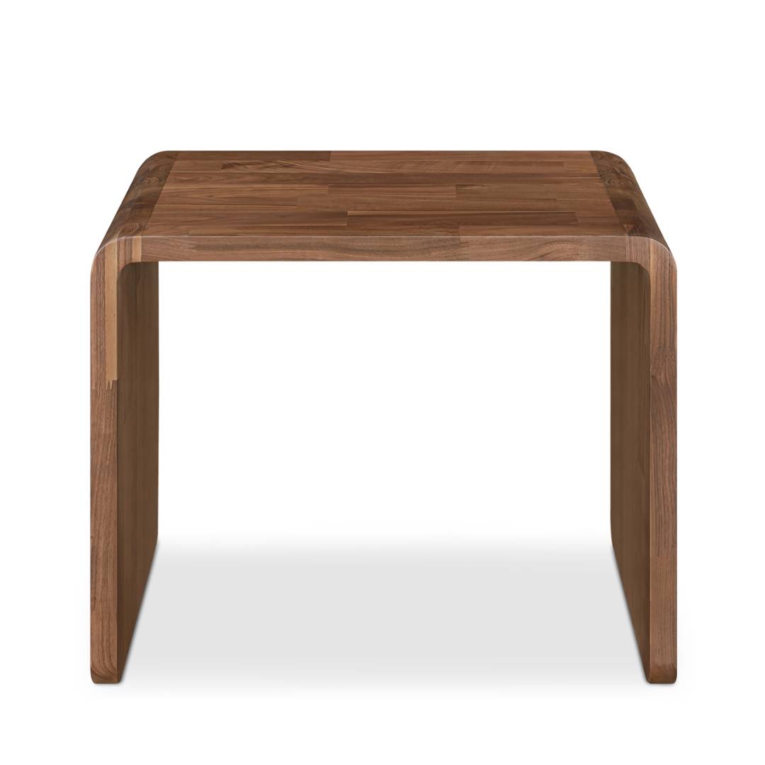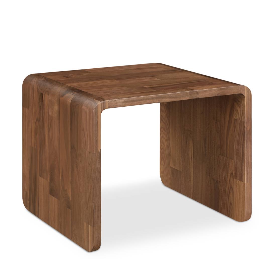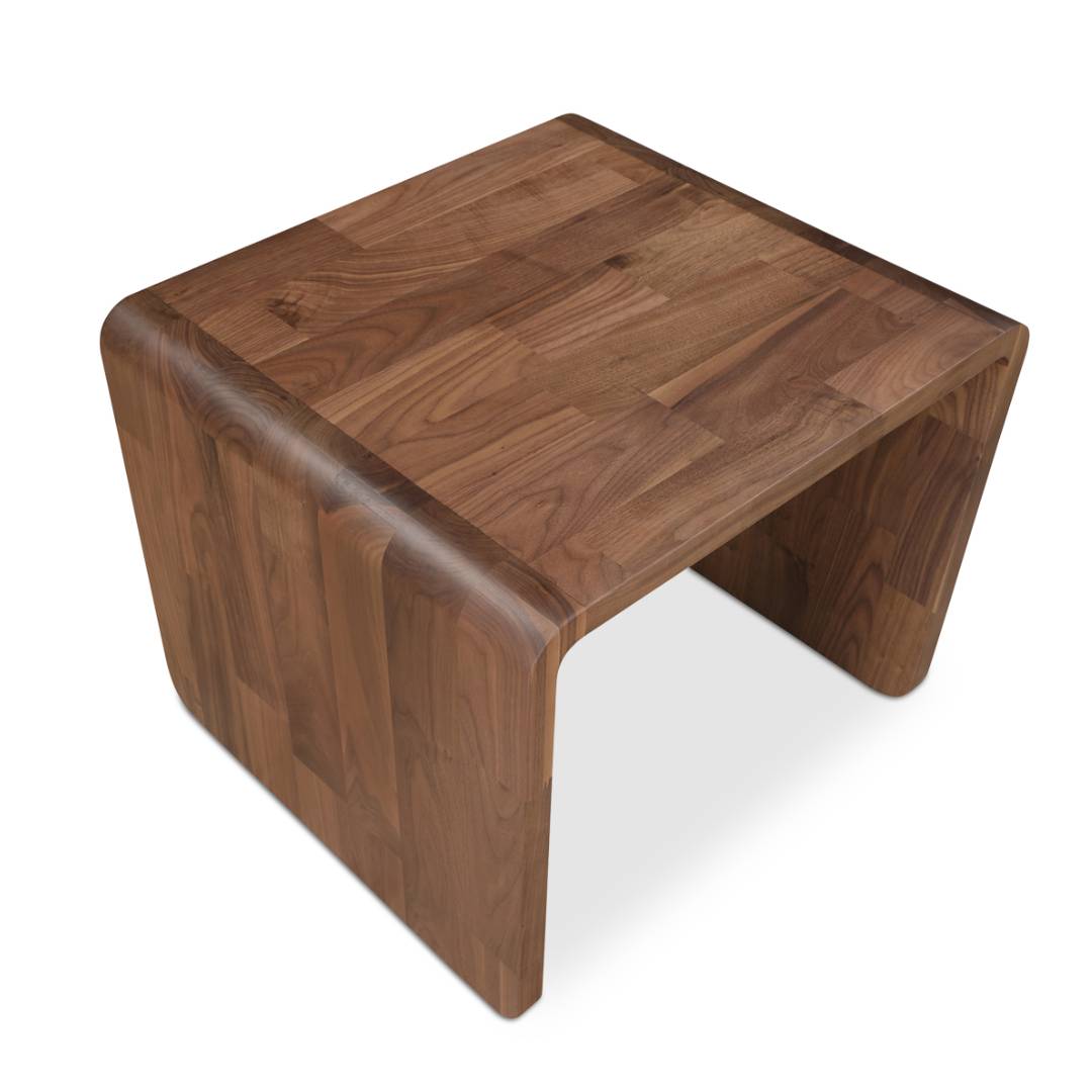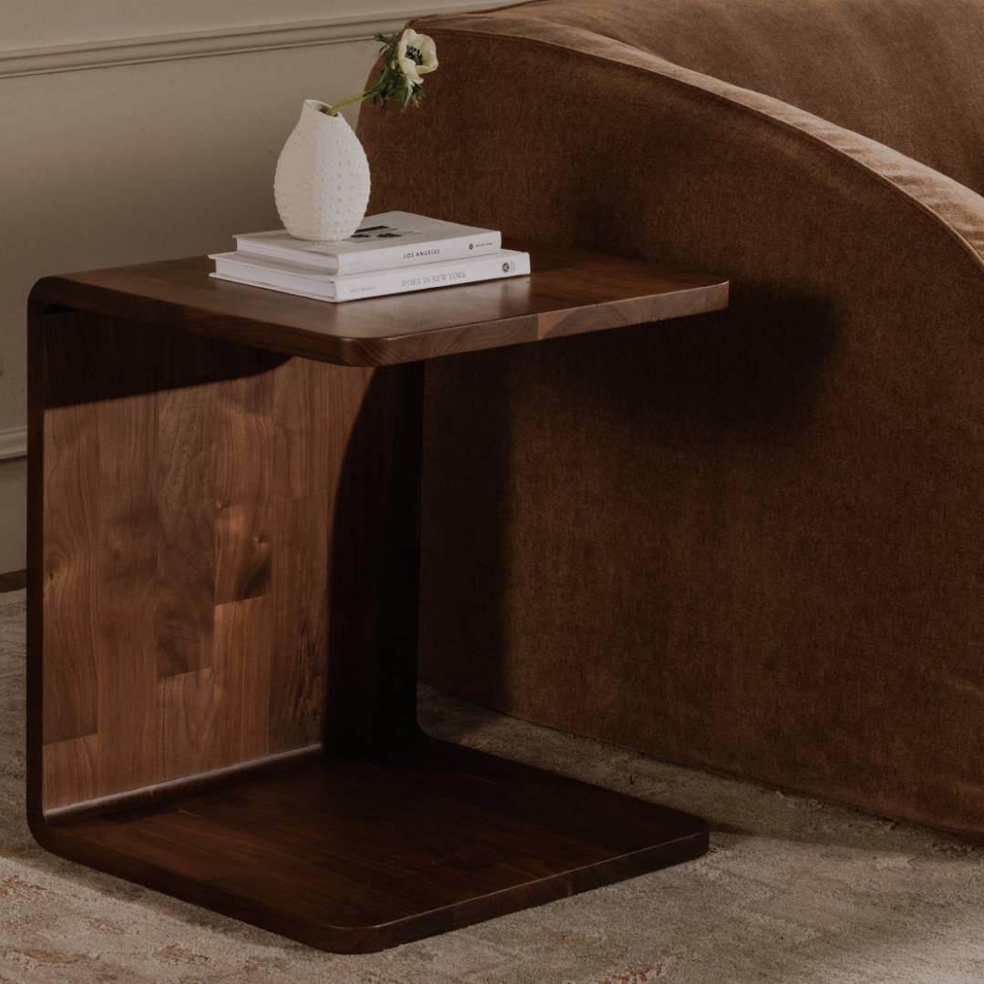 Crafted from rich walnut, the Charlotta Walnut Side Table's silhouette features a gracefully curved edge, introducing organic softness to any space. It seamlessly integrates with various sofa styles.