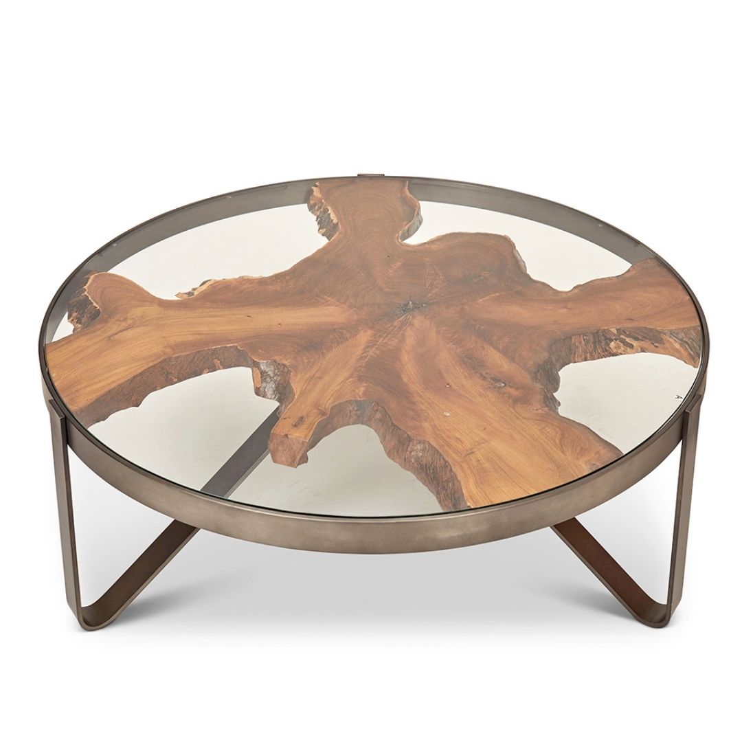 Mixing organic and industrial designs, the Sylvan Echo Coffee Table features a solid teak slab laid in tempered glass. The top is encased in galvanized gray stainless steel and sits a top steel legs, creating sleek lines.