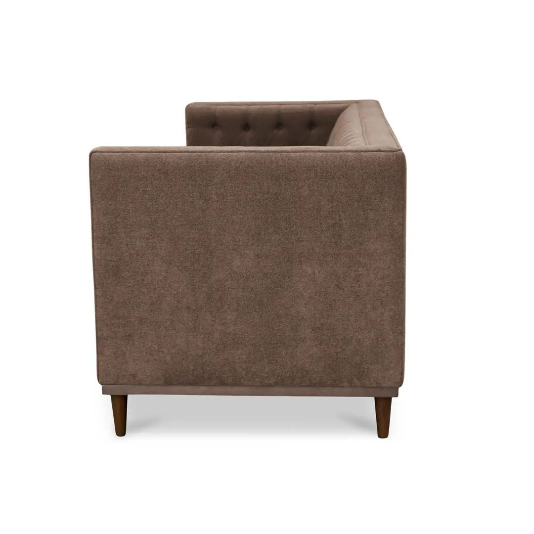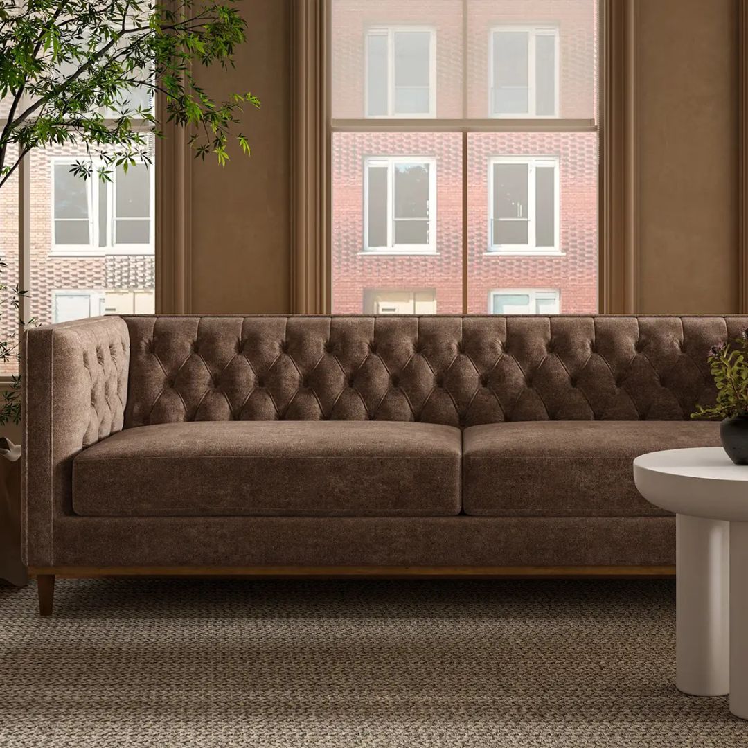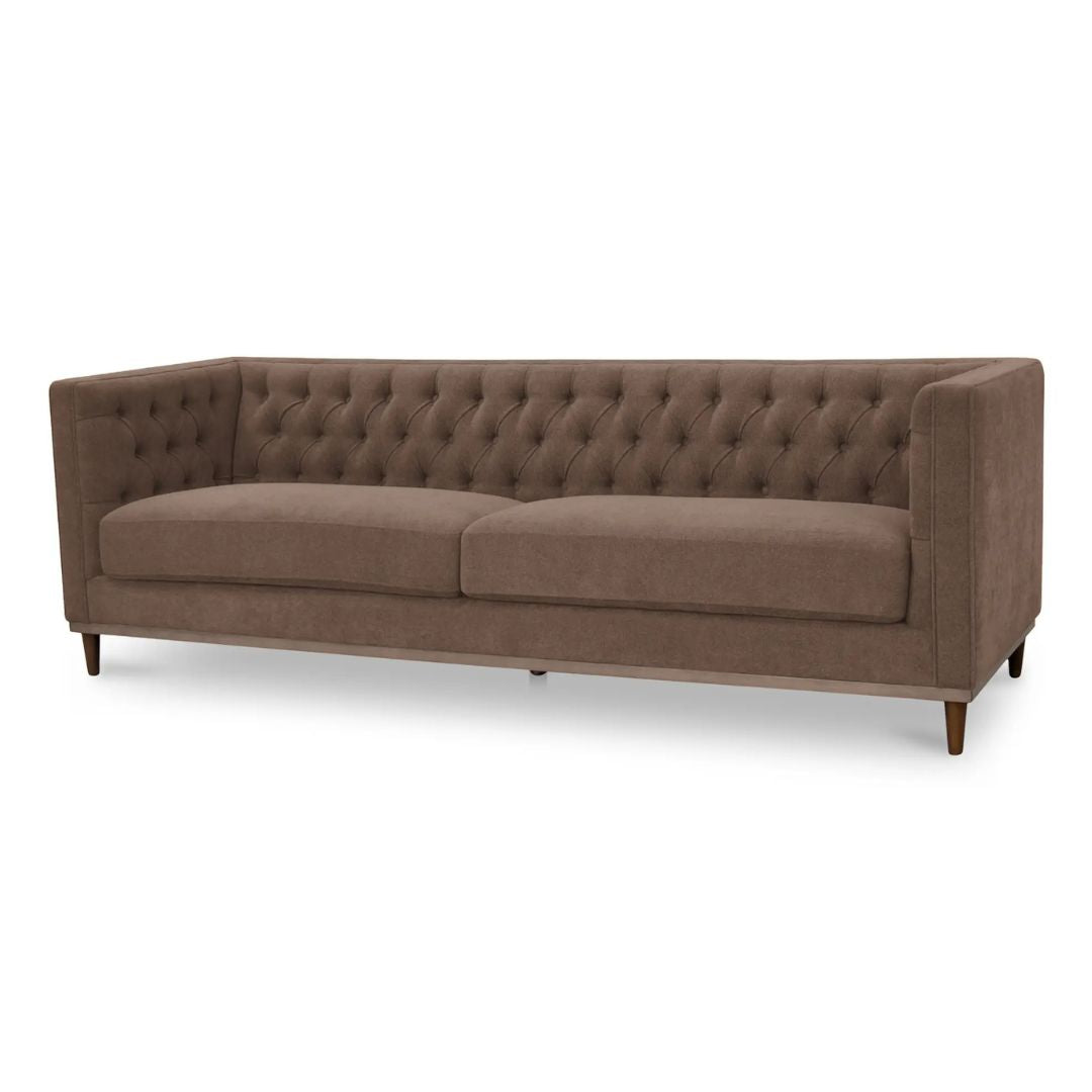The Wentworth sofa combines traditional elegance with contemporary resilience, featuring a soft textured fabric upholstery. The classic form includes tufted details, providing a nod to traditional aesthetics, while the clean lines and warm walnut finish on the wooden base inject a modern touch.