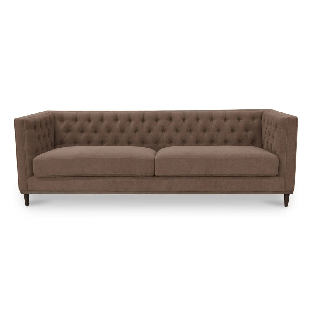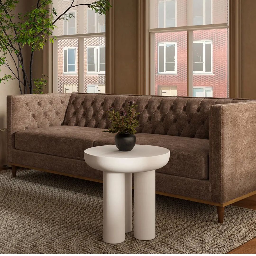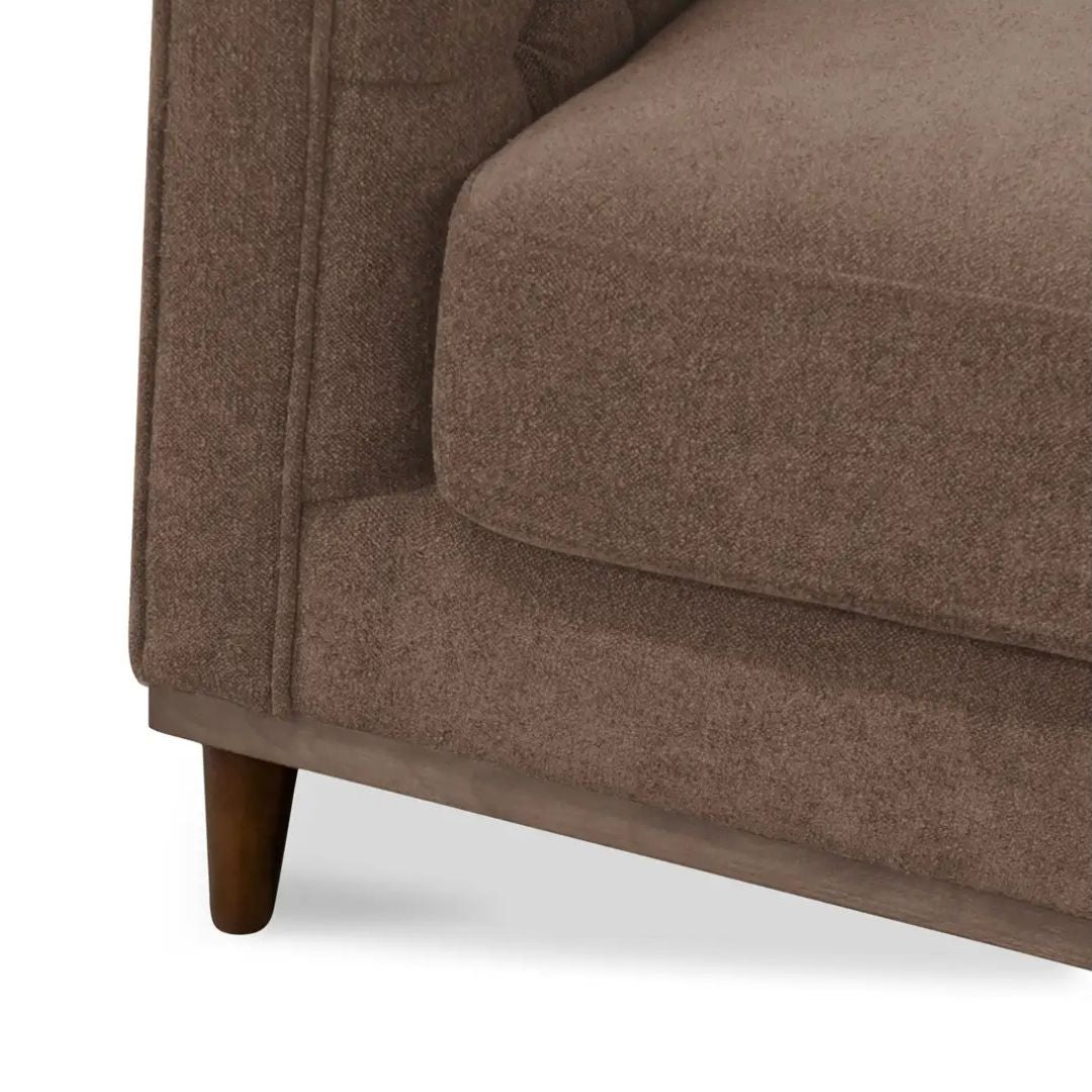 The Wentworth sofa combines traditional elegance with contemporary resilience, featuring a soft textured fabric upholstery. The classic form includes tufted details, providing a nod to traditional aesthetics, while the clean lines and warm walnut finish on the wooden base inject a modern touch.