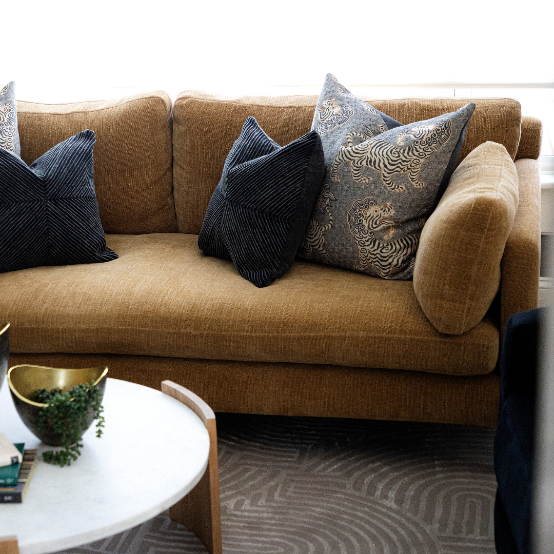 The Gina Mid-Century Modern Sofa features clean lines, supportive cushions, and rich golden upholstery, all grounded by tapered wood legs. A perfect blend of style and comfort for modern, transitional, or minimalist living spaces.