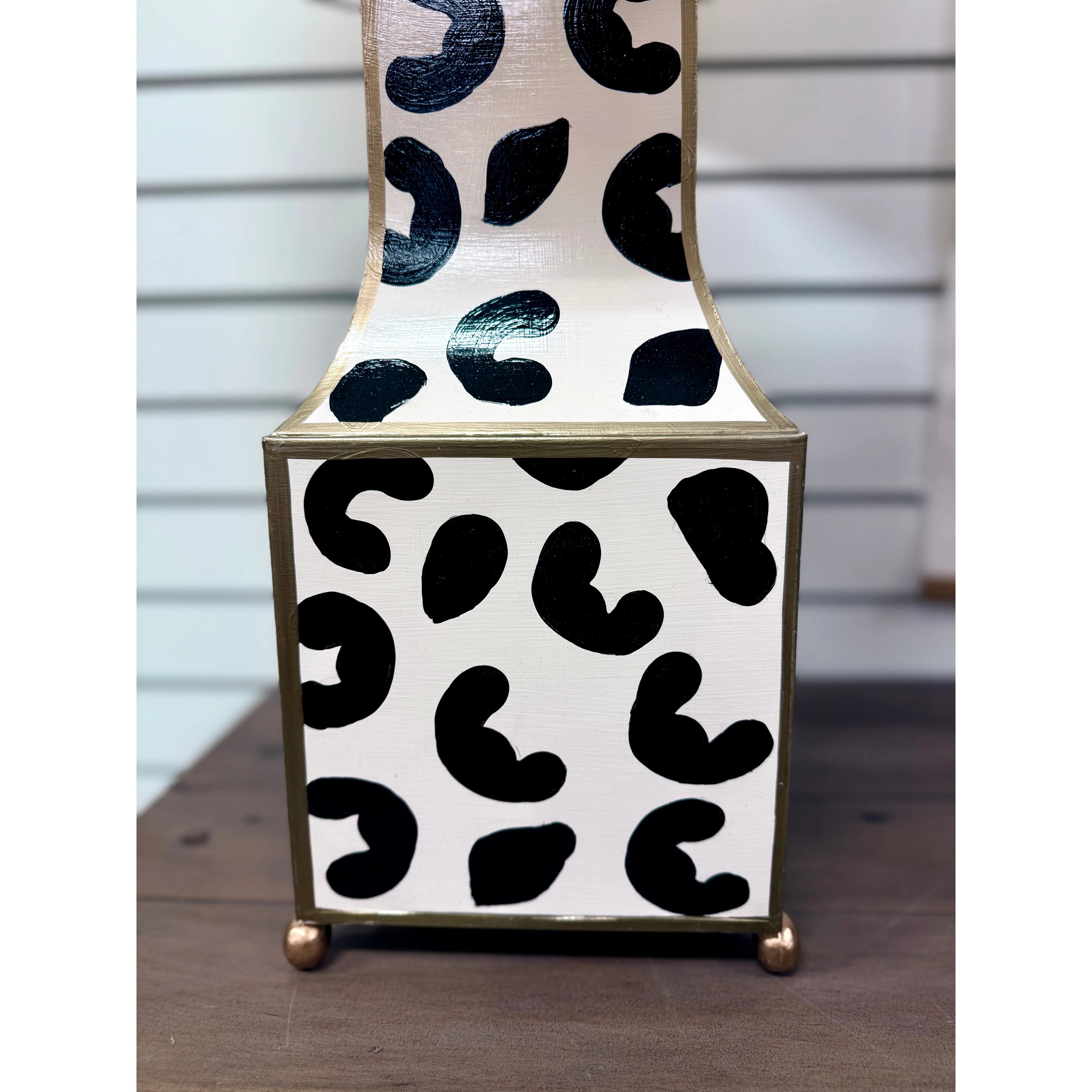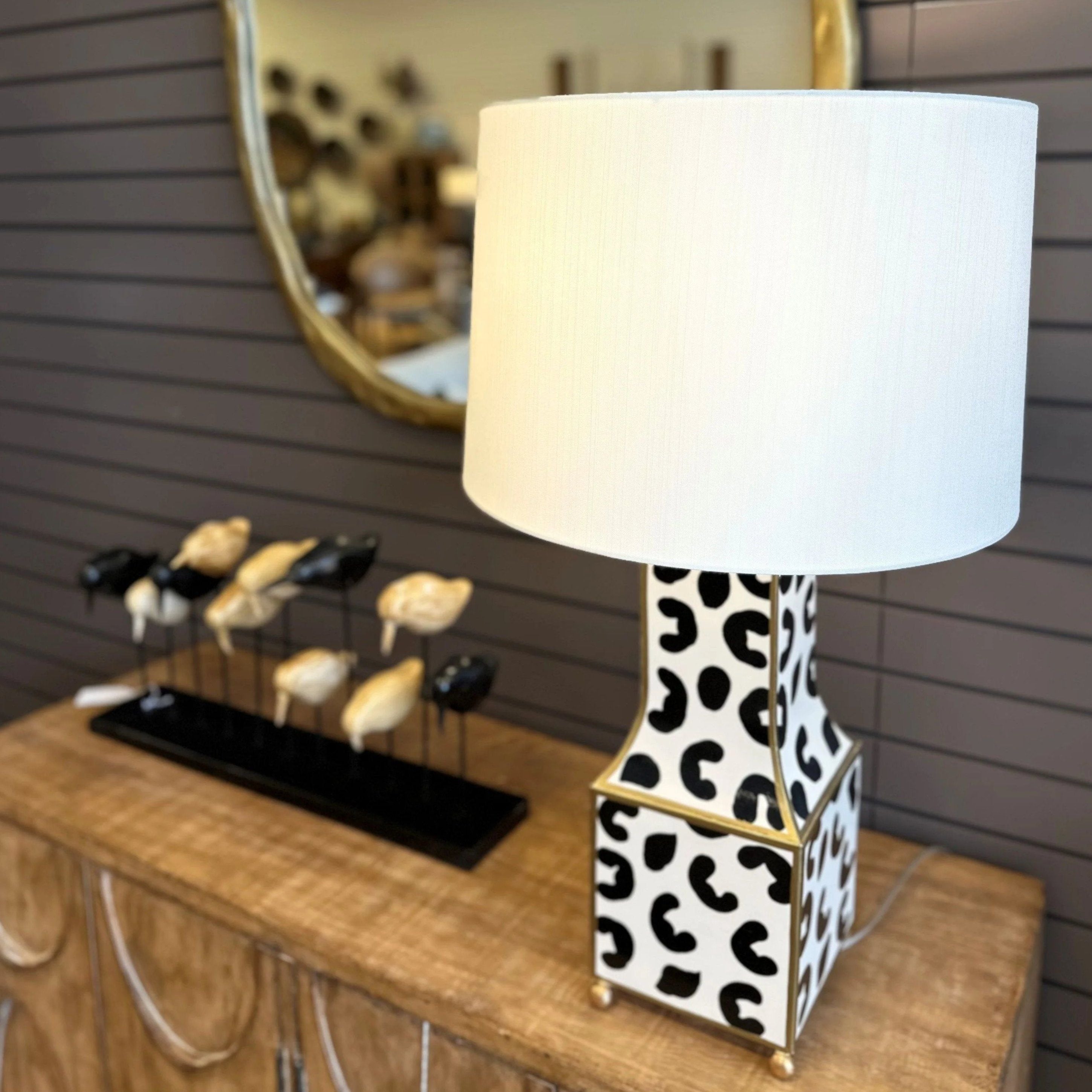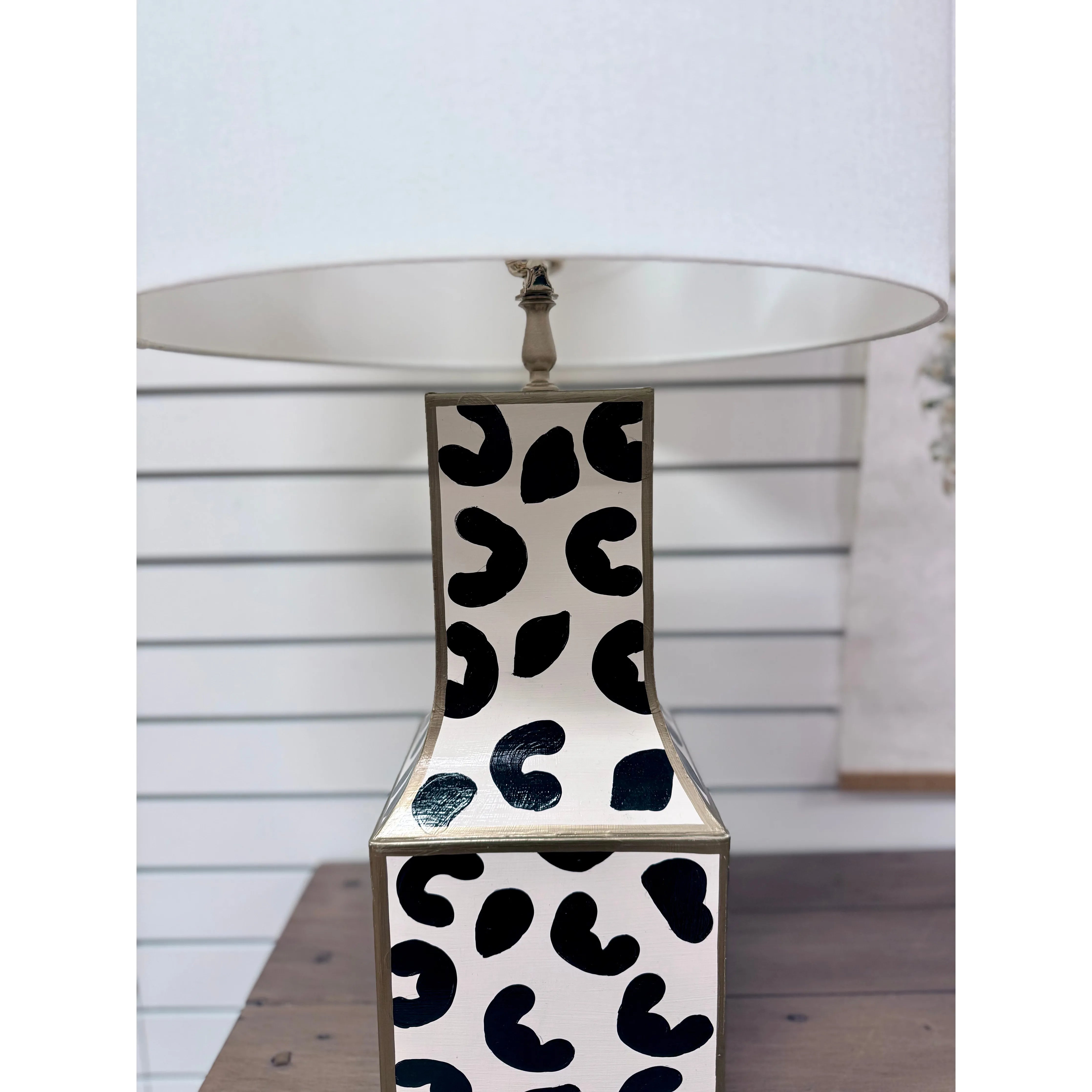 Elevate your space with the Strata Lamp. This beautifully hand-painted piece features intricate gold, black, and white details, elevating the appearance of any space and providing a sophisticated touch of elegance. Its elegant metal design complements any room's decor, creating a truly eye-catching statement piece.