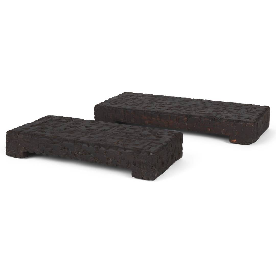 These low-profile wood risers feature a richly textured, charred finish that adds depth and grounding contrast to styled surfaces. Designed to elevate decor objects, candles, or planters, they bring quiet drama and sculptural presence to consoles, shelves, and dining tables.