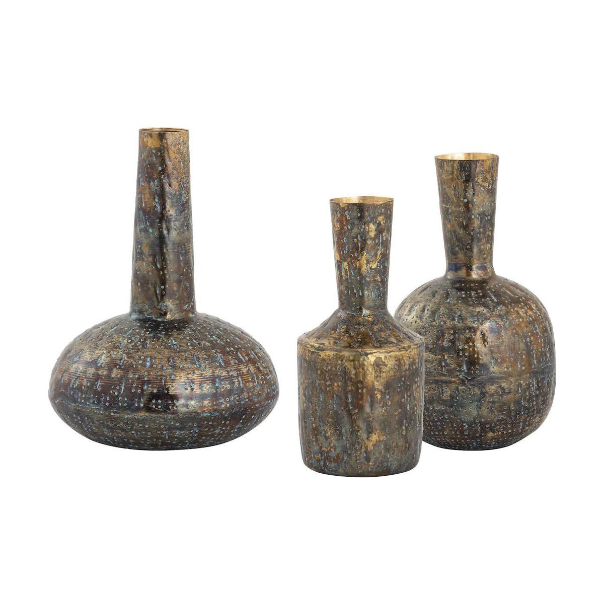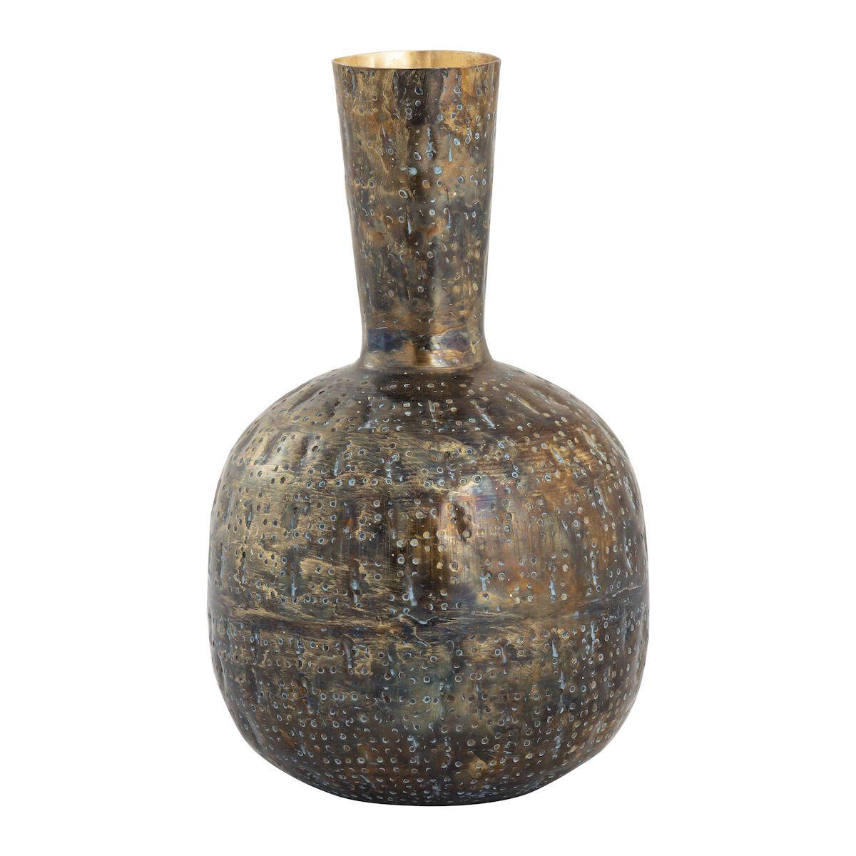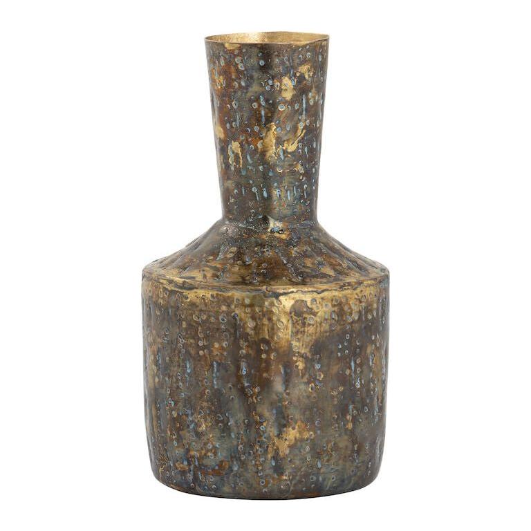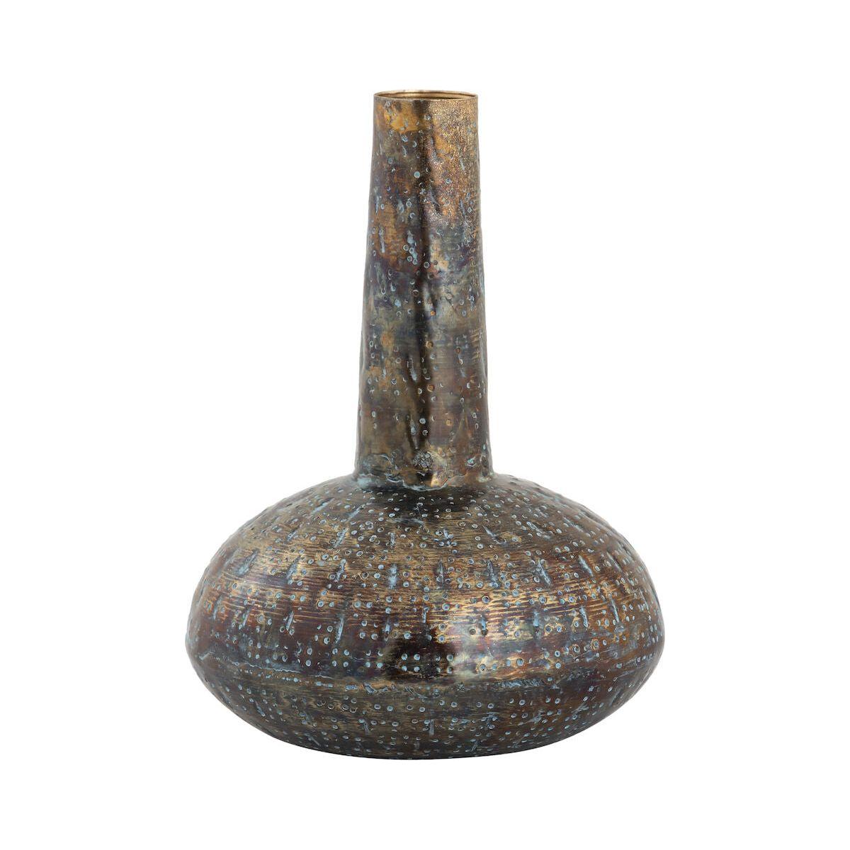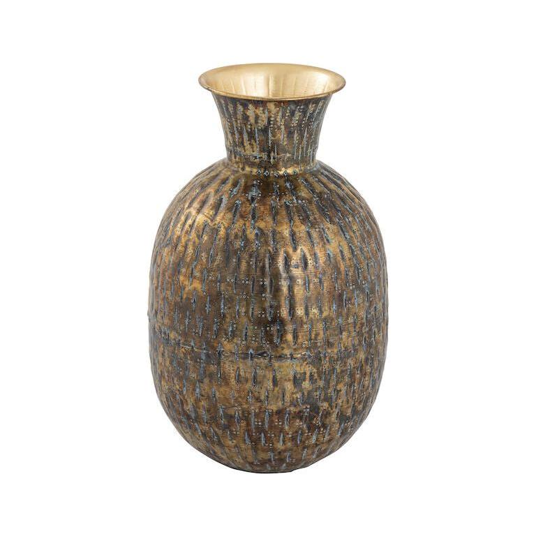 This Patinated Brass Vase boasts unique shapes and a textured, patinated finish. Its rounded body narrows at the neck and features a slightly fluted mouth opening, adding a touch of elegance to any space. Perfect for displaying flowers or as a standalone item, it is a must-have for any home decor enthusiast.