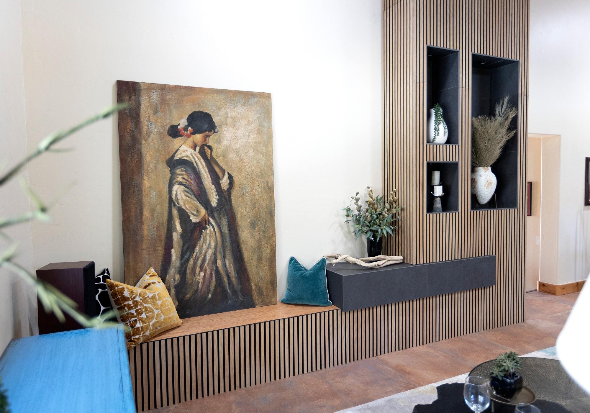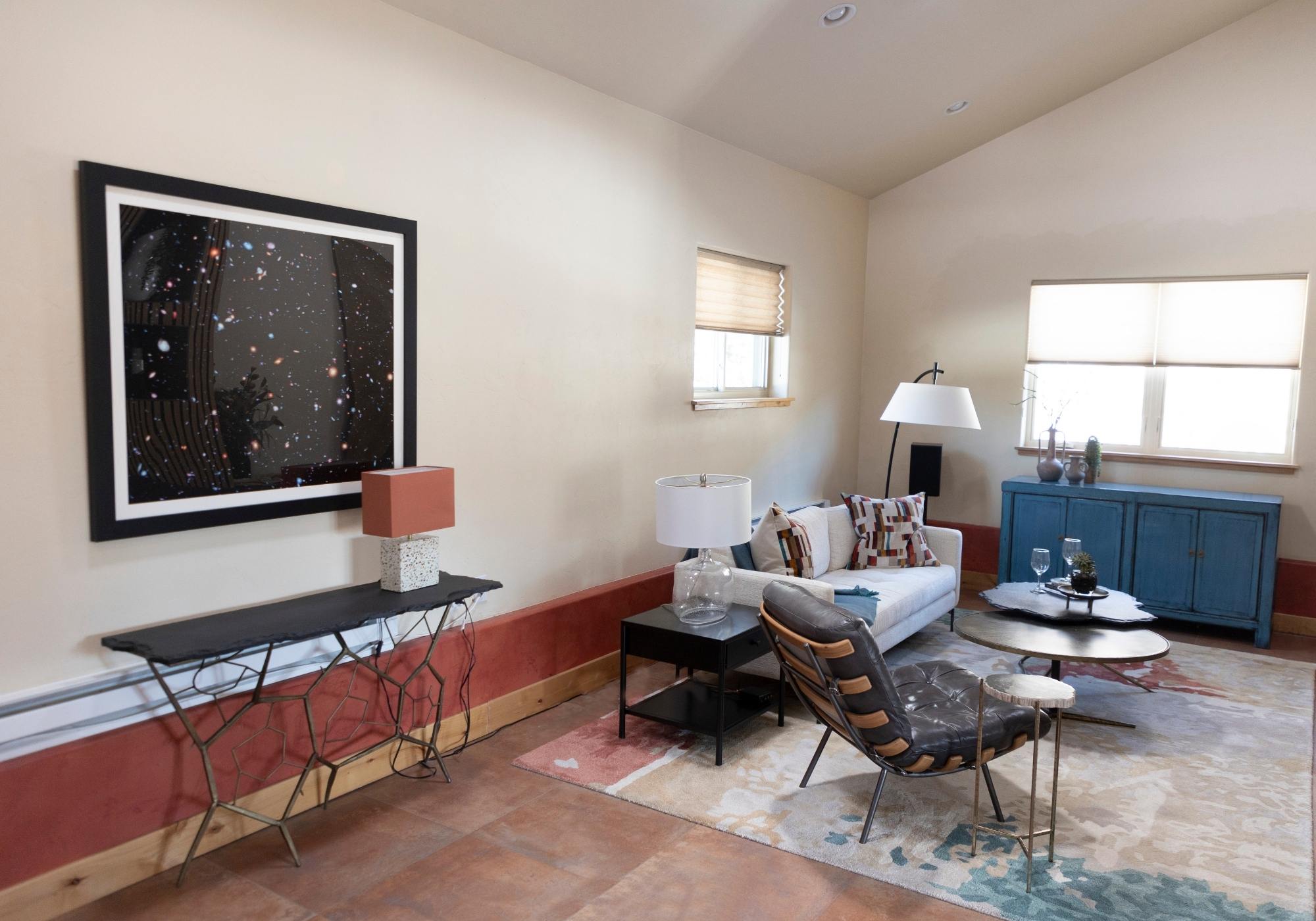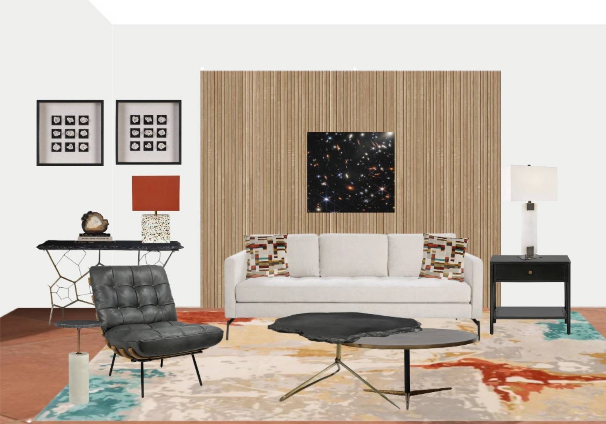 This project began with our client’s vision of transforming an underutilized room into a warm and inviting gathering space for conversation, music, and relaxation. Anchored by a cherished Hubble Telescope photograph, we crafted a beautifully styled and meaningful environment. A carefully selected palette of neutral tones, vibrant accents, layered textures, and organic shapes brought both intimacy and inspiration.