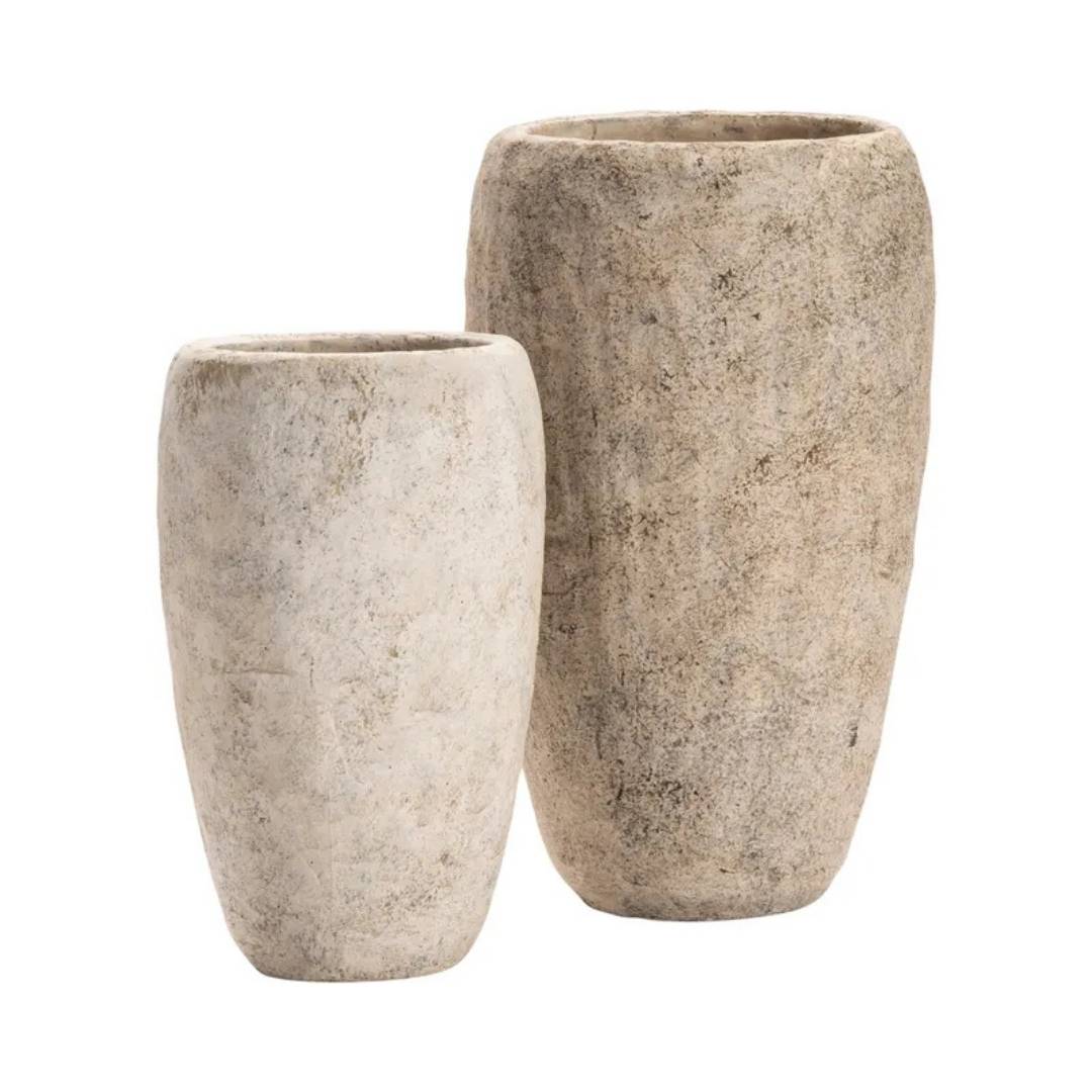 The Adrea Vases have been made from textured cement. They have a gray and black stippled finish that gives them a very neutral presence in your room. These vases would look beautiful with floral arrangements in them to add color to your room.