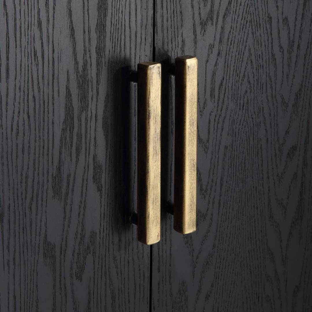 - Ebony oak veneer with iron pulls in aged gold