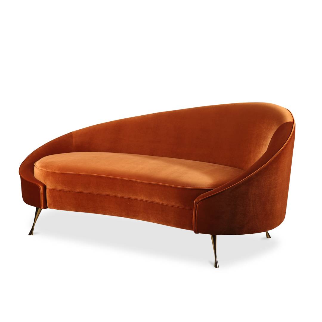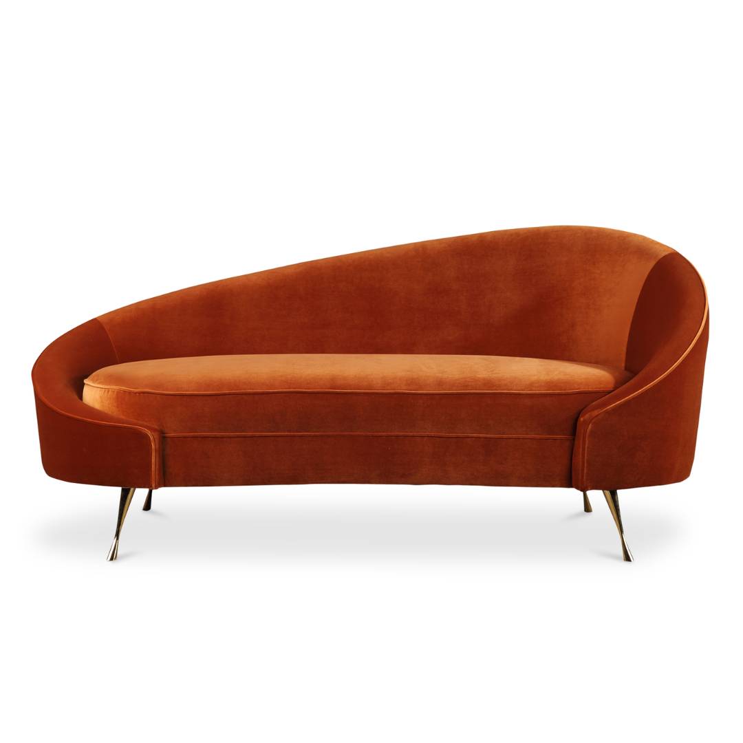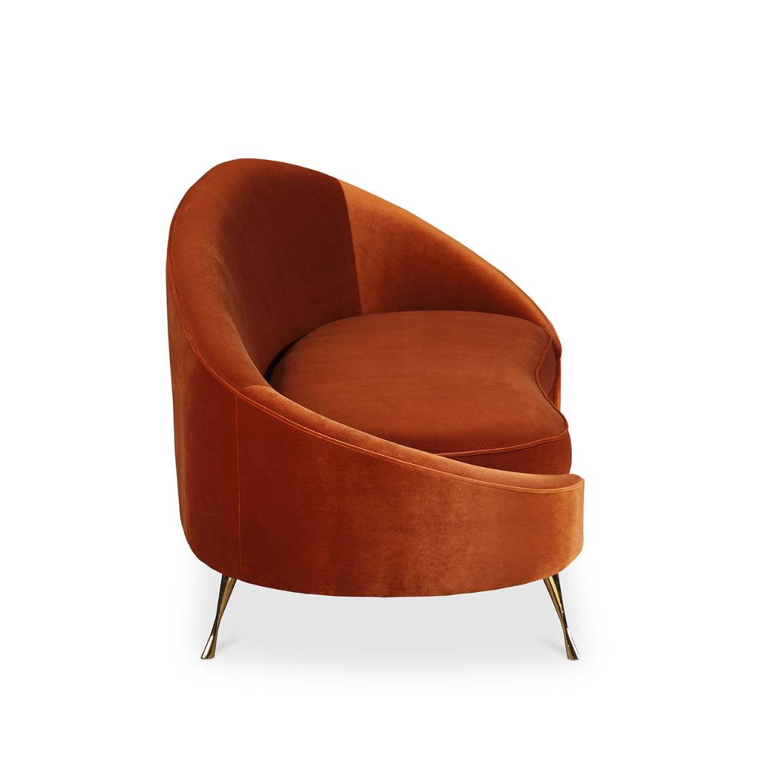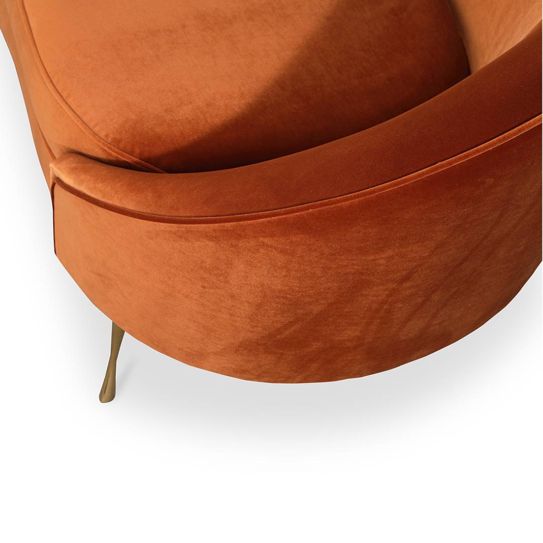 The Aurelle Chaise/settee embodies sculptural elegance with its curved silhouette, burnished rust velvet upholstery, and tapered brass legs. Compact yet statement-making, it infuses any space with warm sophistication and a touch of glamour. Perfect for the 60s-obsessed or anyone with impeccable taste.