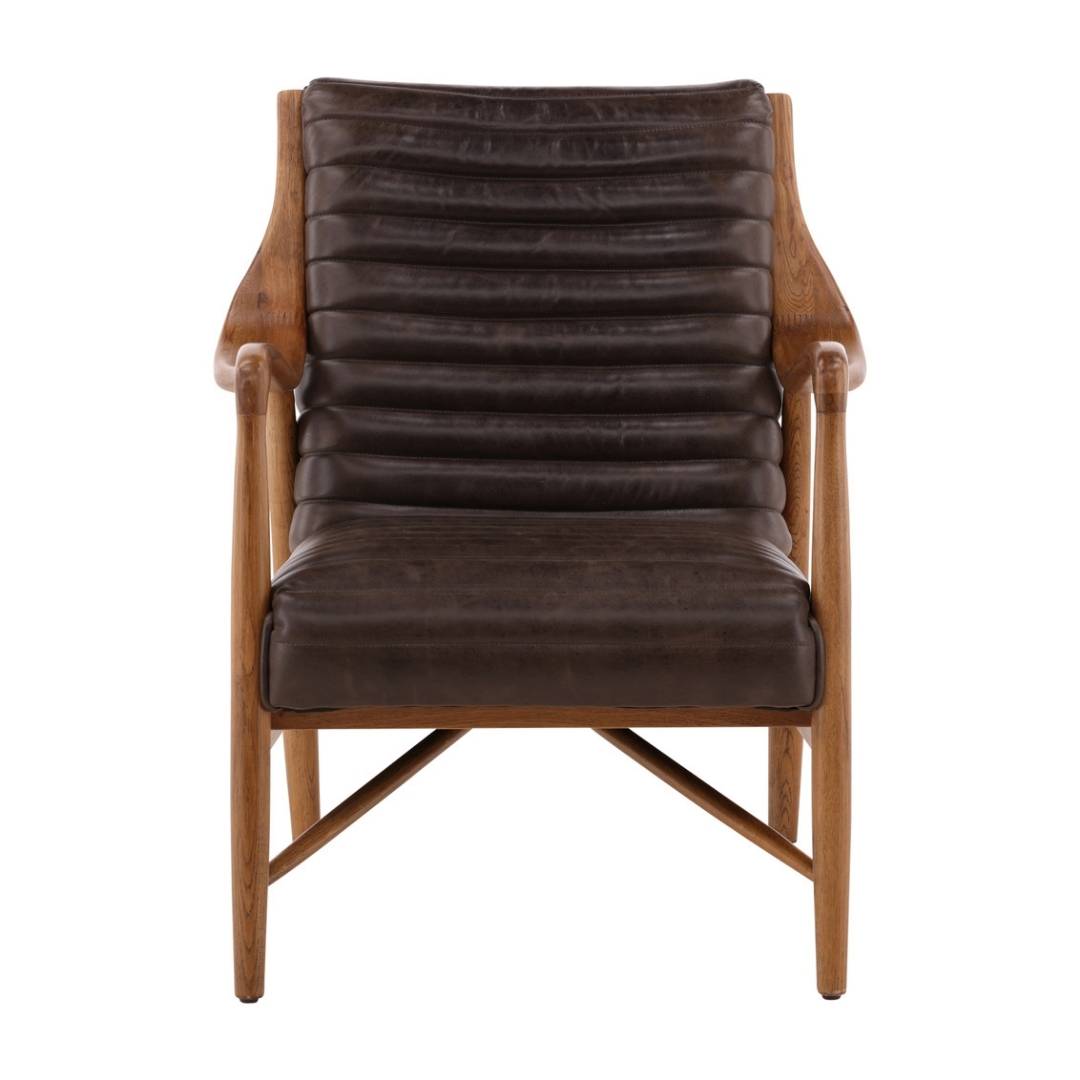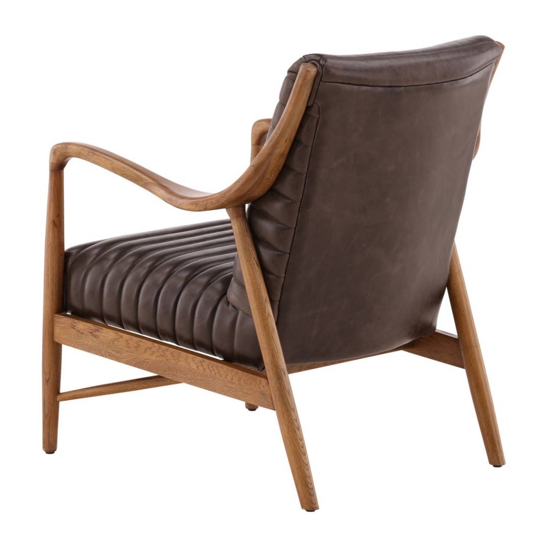A warm blend of rich leather and sculptural wood creates a lounge chair that feels both timeless and inviting. The channel-stitched design and curved wood arms provide comfort while delivering a refined mid-century inspired silhouette.