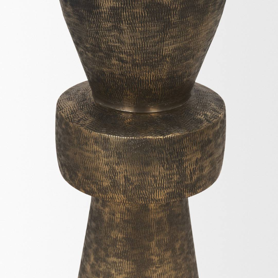 This sculptural candleholder brings timeless warmth to tabletops with its textured bronze-like finish and architectural silhouette. Designed to elevate any pillar candle with refined presence, it pairs beautifully with both modern and classic interiors.
