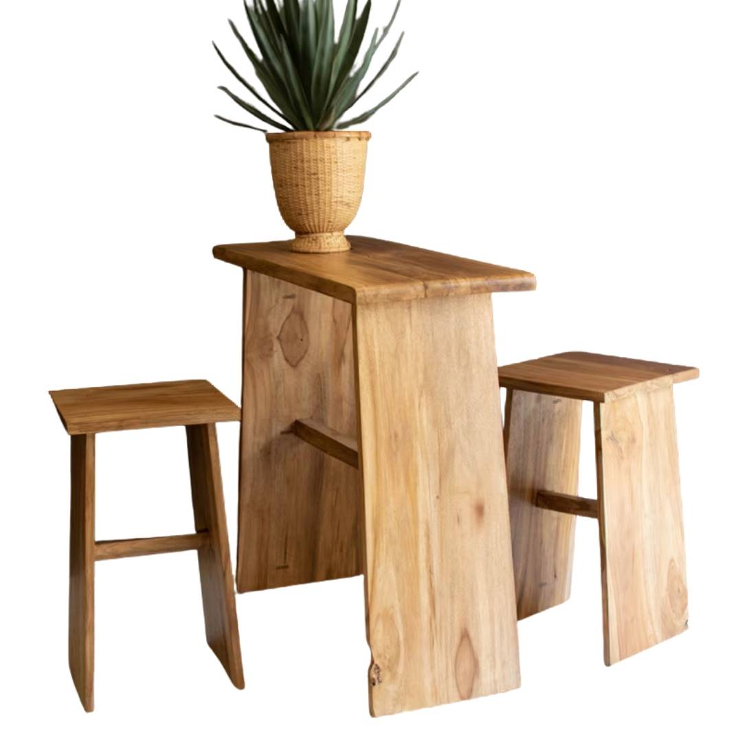 The bar top features beautiful grain patterns and a sturdy feel, while the matching stools provide comfortable seating with rustic charm. Whether used for morning coffee, casual dinners, or entertaining friends, this set adds a handcrafted, welcoming presence to kitchens and patios alike.