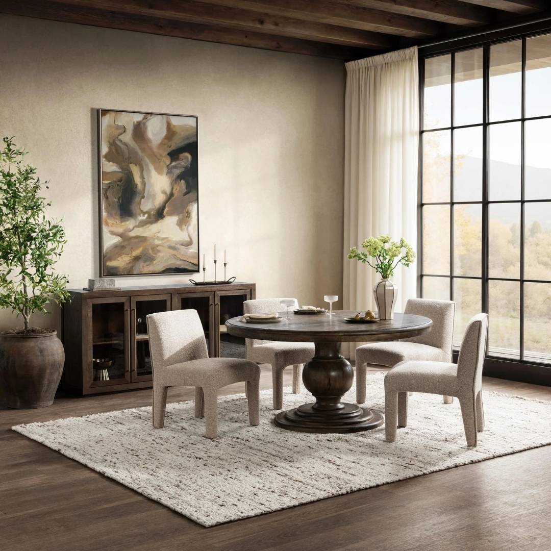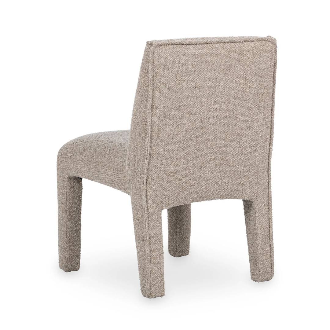 Wrapped in textured bouclé-style upholstery, this sculptural chair brings softness and modern simplicity to the dining room. Its fully upholstered frame and gently curved seat create an inviting, elevated look that feels both cozy and refined.