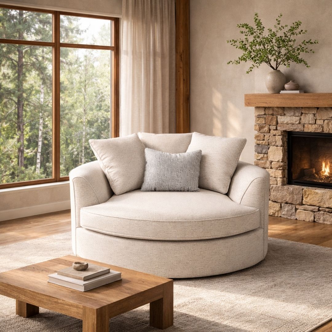 Sink into effortless comfort with this oversized round lounge chair, featuring plush cushioning and soft neutral upholstery that complements any refined living space. Its curved silhouette and layered pillows create a cozy, inviting seat perfect for relaxing, reading, or conversation.